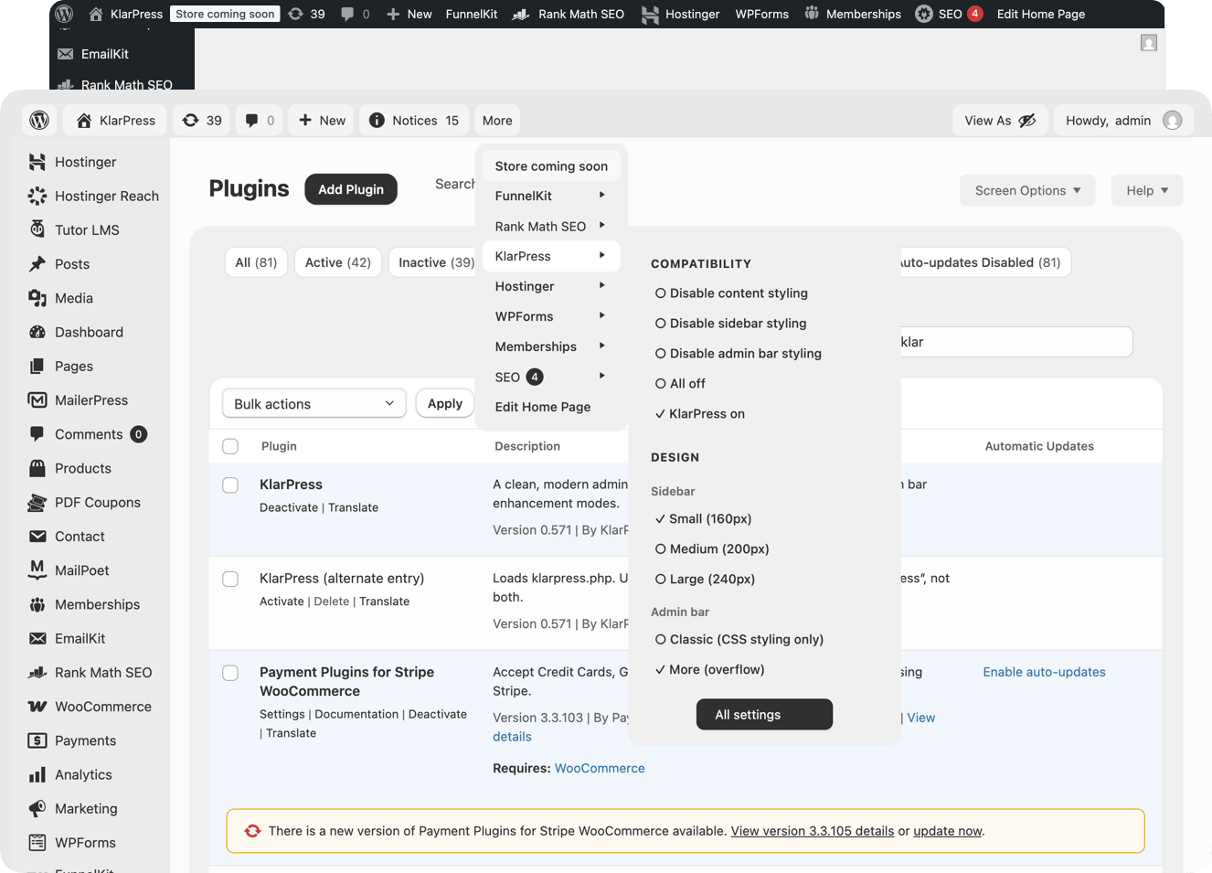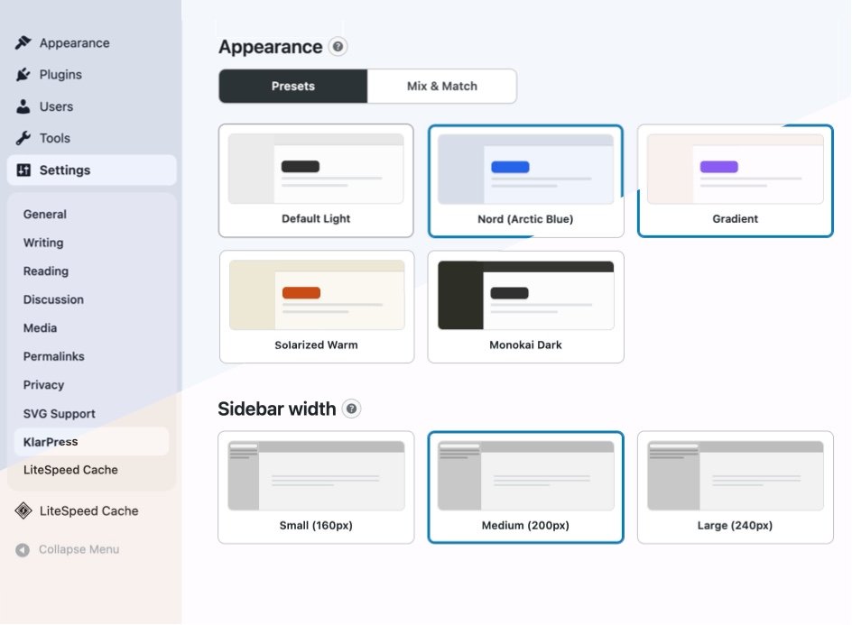 Everything goes back to the standard WordPress admin instantly. KlarPress only applies visual styles—it doesn’t modify your database, your content, or your core settings. There is zero risk and zero cleanup required if you ever decide to remove it.
